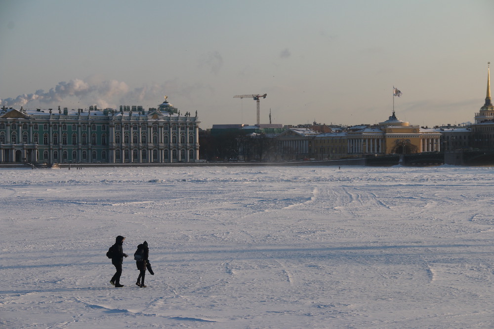 思い出2月、凍結したネヴァ川の氷上を歩く男女。その背後、冬の大気のプリズムを通してサンクトペテルブルグの街並みが遠く広がっている。