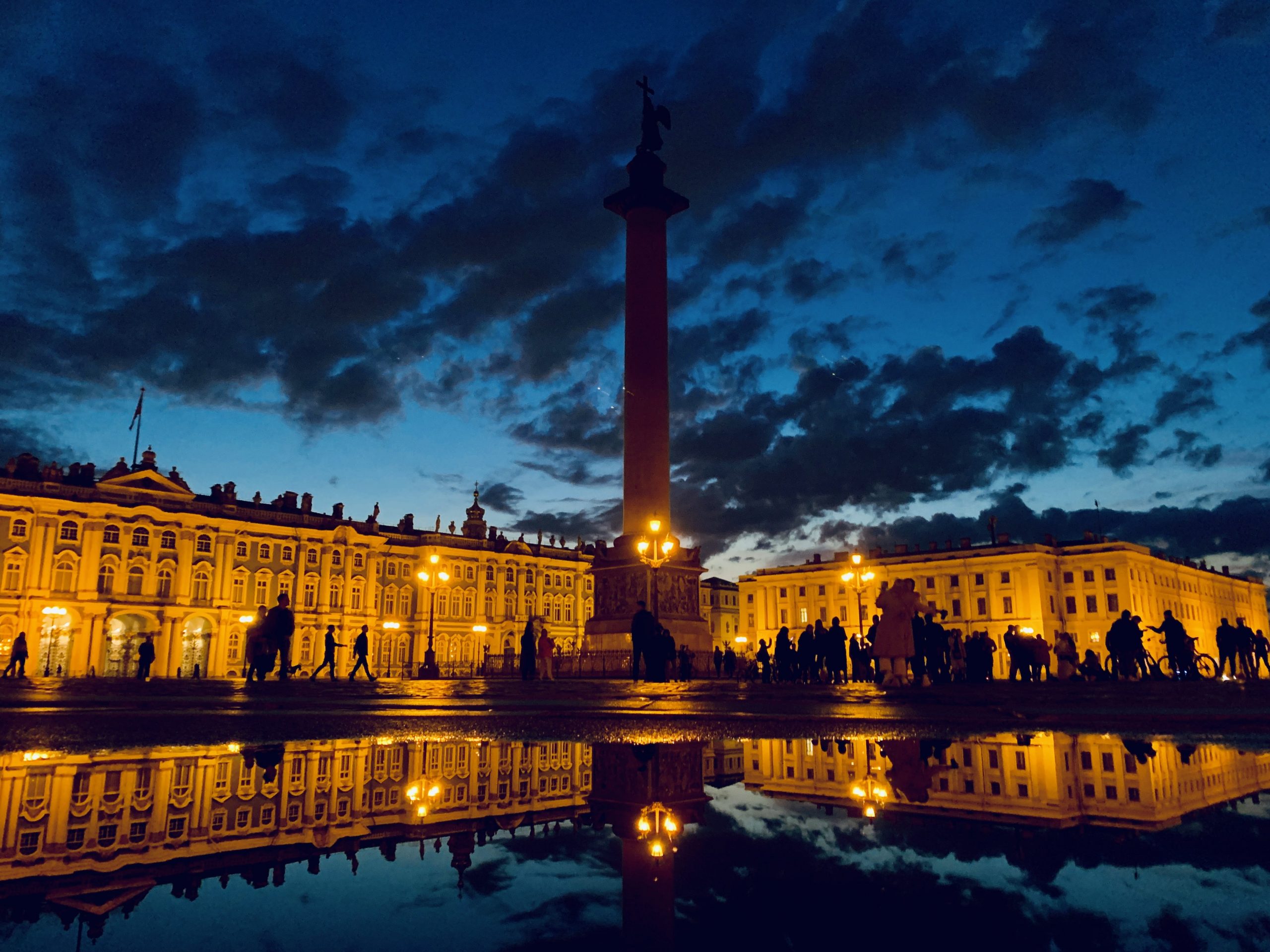 思い出白夜の宮殿広場。時刻は深夜1時。 雨上がりのタイルには大きな水たまりが。 足下に広がる鏡は美しい冬の宮殿を映し出す。